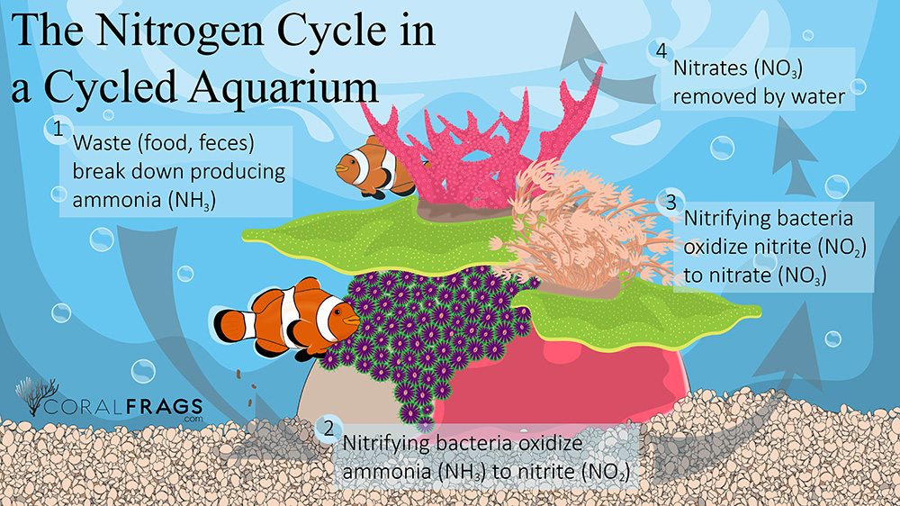 - Around twenty-two or more days after the first introduction of ammonia in a tropical marine system, you will likely begin to see the first traces of nitrate (NO3) in your water quality tests. This indicates that the genera of nitrifying bacteria that can oxidize units of nitrite into much less harmful nitrate are present. At this point, we say that the system is cycled, as all of the bacteria necessary for healthy biological filtration on your system are present and helping you keep ammonia and nitrite levels near zero.